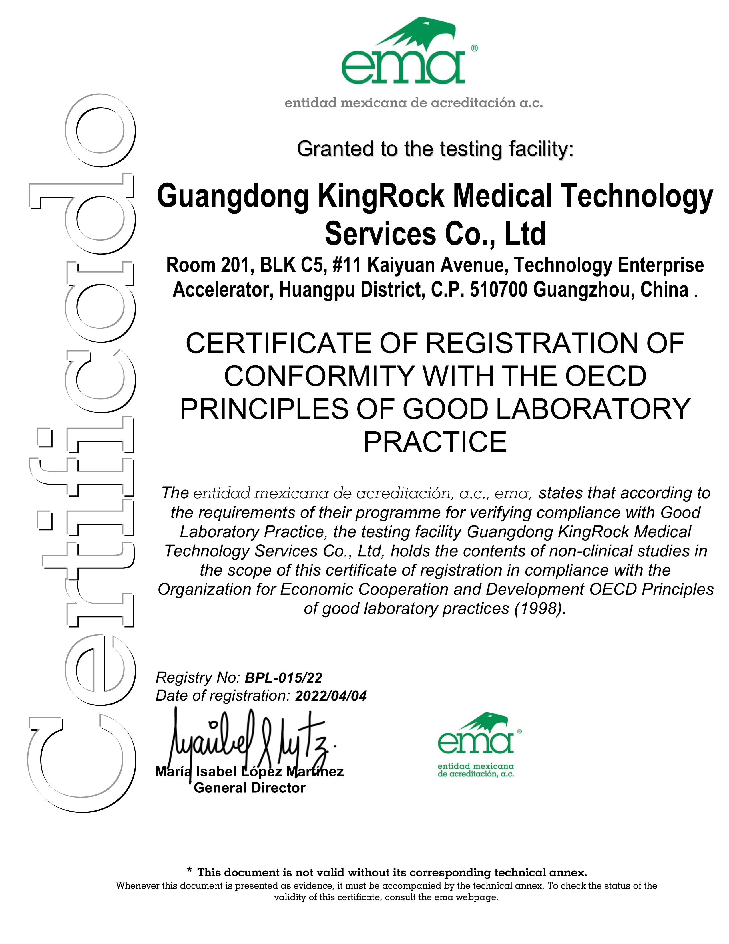 2022年4月4日,广东金石医疗GLP动物实验室正式通过由经济合作与发展组织(Organization for Economic Co-operation and Development),简称经合组织(OECD)成员国墨西哥GLP监管署ema-Mexican Accreditation Body的 GLP评审,获得OECD GLP证书。